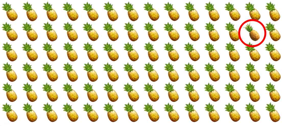 Na imagem há muitos ananases, dispostos em várias filas. A ttarefa é encontrar um ananás especial que seja diferente de todos os outros.