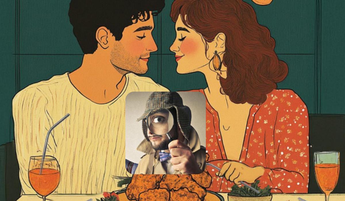 À sfrente estão um homem e uma mulher apaixonados, conversando agradavelmente durante um jantar romântico. A rapariga está vestida com um vestido elegante e o rapaz – com uma camisola leve. Na mesa, vêem-se copos com bebidas e vários pratos saborosos. Há qros pendurados nas paredes do estabelecimento e lâmpadas penduradas no teto.