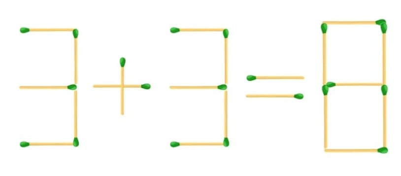 O segredo está em mudar a forma dos números: basta mover um fósforo para que um dos “três” se transforme num “cinco”. Depois disso, o exemplo torna-se absolutamente correto – 5+3=8.