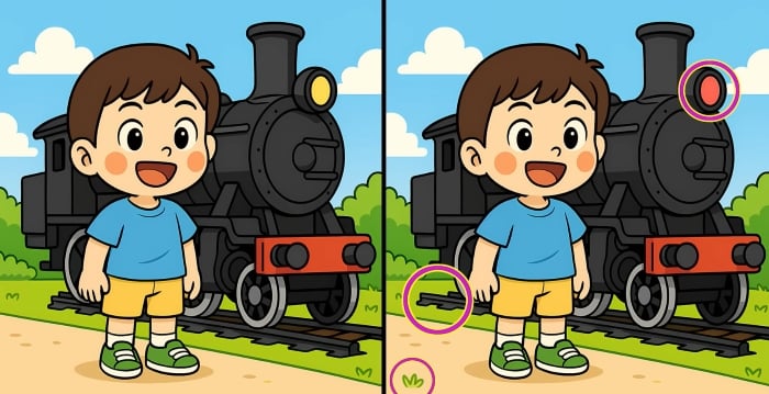 Então, estás pronto para o próximo desafio? Observe com atenção as d imagens do rapaz junto ao comboio a vapor. Podem parecer idênticas à primeira vista, mas existem 3 pequenas diferenças. Achas que consegues encontrá-las todas em 29 segundos? Experimenta e testa a tacuidade vis!