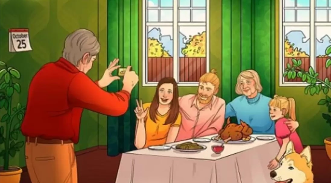 A data no calendário deve ser 22 de outubro. A imagem mostra uma família a celebrar o Dia de Ação de Graças, o que é sugerido pelo peru assado – um prato tradicional deste feriado. Na Ucrânia, o Dia de Ação de Graças é celebrado a 22 de outubro.