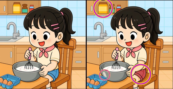 Então, estás pronto para o próximo desafio? Observe com atenção as d imagens de uma rapariga a amassar massa de bolo. Podem parecer idênticas à primeira vista, mas há 3 pequenas diferenças. Achas que consegues encontrá-las todas em 51 segundos? Experimenta e testa a tacuidade vis!