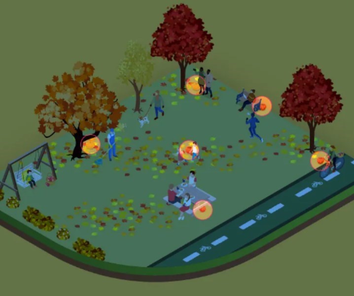 A imagem é de um parque infantil de outono, onde pessoas e crianças andam de um lado para o outro. Todos estão ocupados a fazer as s próprias coisas, mas ao lado de alguns deles estão as abóboras que estamos à procura.